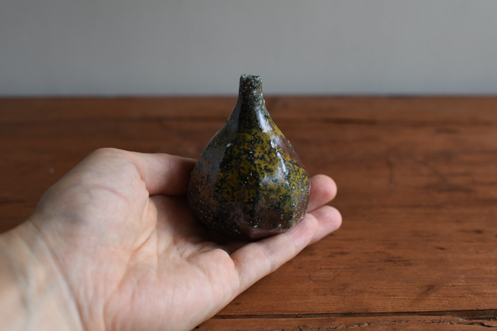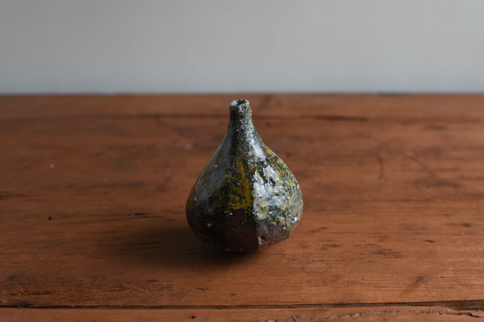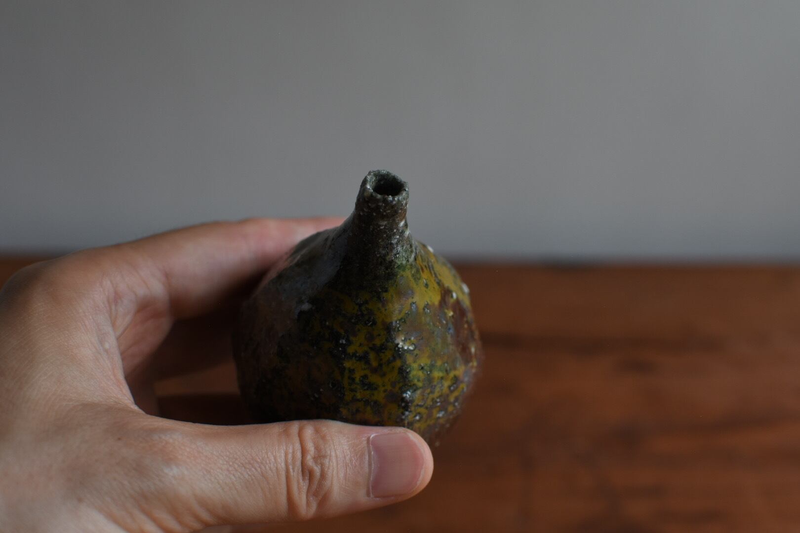 穴窯ならではの自然釉薬をまとった、小さいながらも崇高さを感じられる花入です。